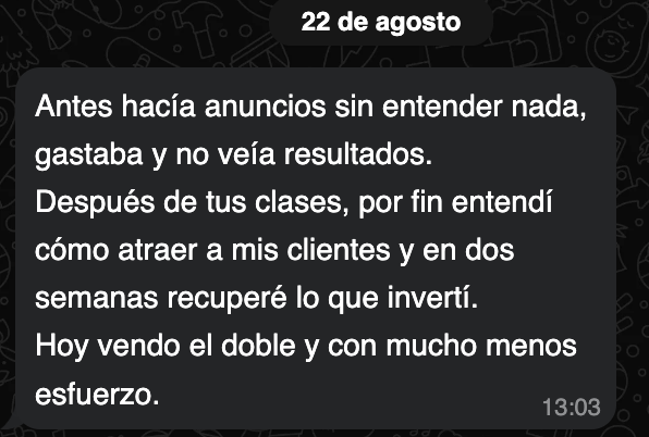 Antes hacía anuncios sin entender nada, gastaba y no veía resultados. Después de tus clases, por fin entendí cómo atraer a mis clientes y en dos semanas recuperé lo que invertí. Hoy vendo el doble y con mucho menos esfuerzo.